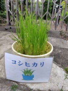 中村さんが門の所にバケツ稲を置き、稲の絵とコシヒカリと書いた看板を立てて、道行く人に「四季の庭」をアッピールしてくれました🐰🐰🐰
